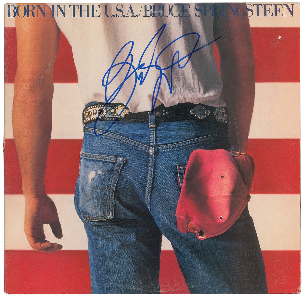 Born in the U.S.A. album by Bruce Springsteen, signed nicely on the front cover in blue felt tip. In fine condition, with price sticker residue, and a tiny area of associated surface loss. The record is included. From The John Brennan In-person Autograph Collection.