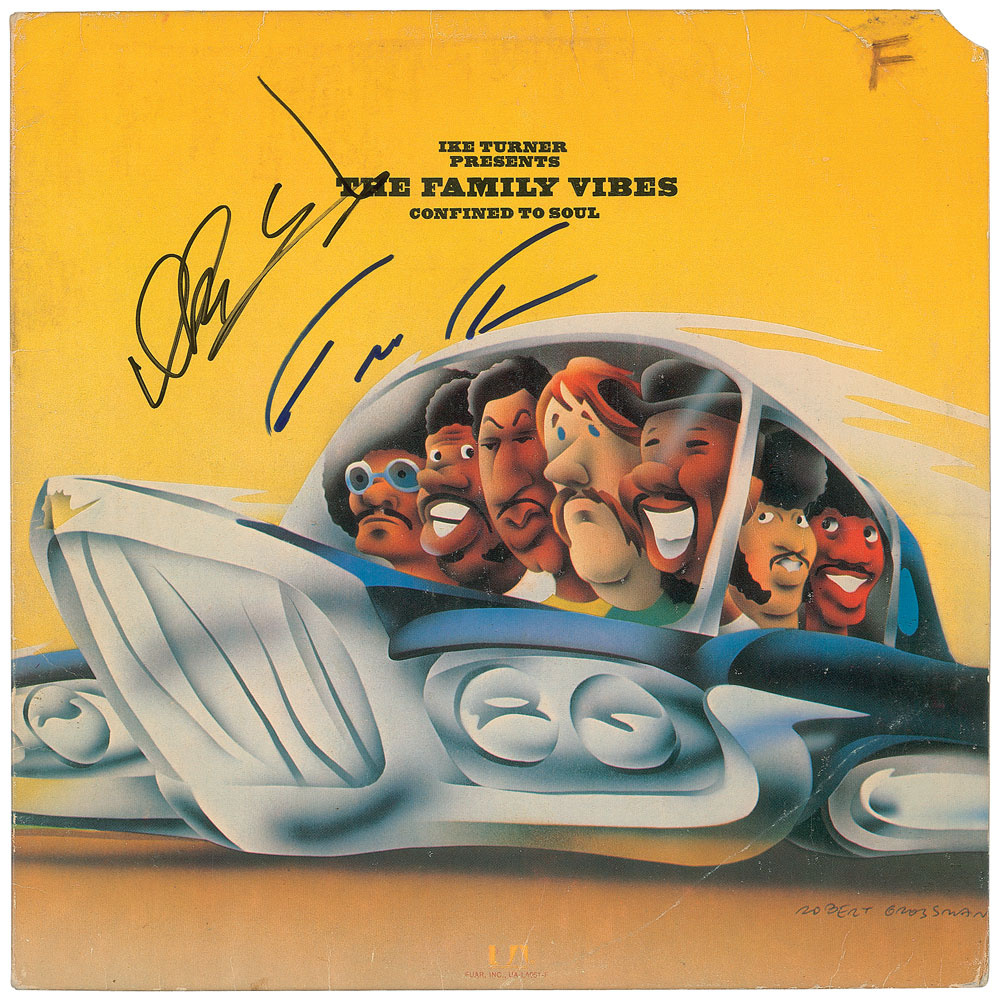 Confined to Soul album by The Family Vibes, signed on the front cover in blue felt tip by Tina Turner and in black felt tip by Ike Turner. In very good to fine condition, with light scuffing, a clipped corner, and an ownership "F" written over an area of price sticker residue. The record is not included. From The John Brennan In-person Autograph Collection.