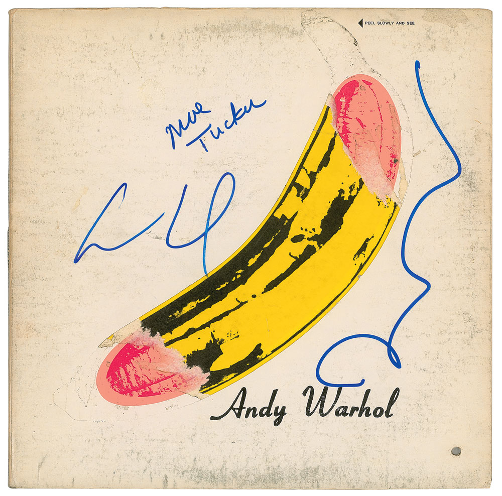 The Velvet Underground & Nico album signed on the front cover in blue felt tip by Lou Reed, Moe Tucker, and John Cale. In very good condition, with scuffing and soiling, a discount hole, and the banana sticker partially removed. The record is included. From The John Brennan In-person Autograph Collection.
