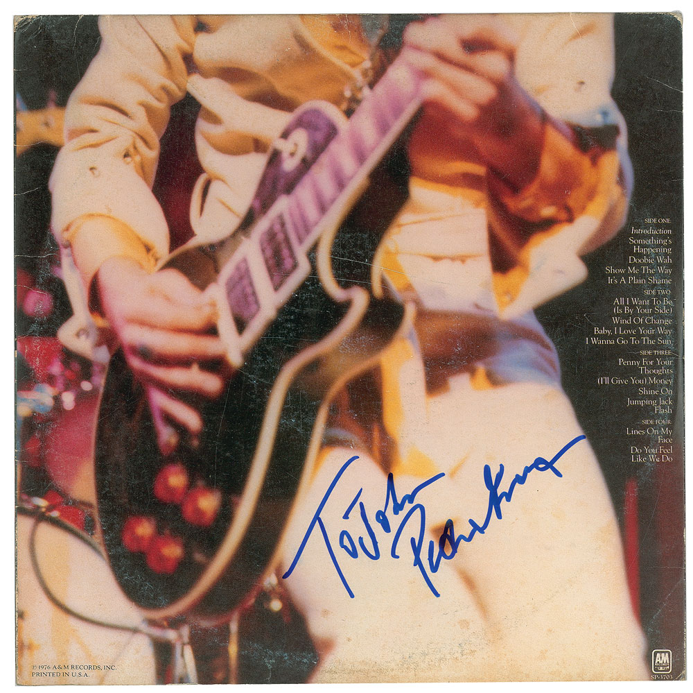 Frampton Comes Alive! album signed and inscribed on the back cover in blue felt tip, "To John, Peter Frampton." In very good to fine condition, with light scuffing, and some sticker residue to the front. The record is included. From The John Brennan In-person Autograph Collection.