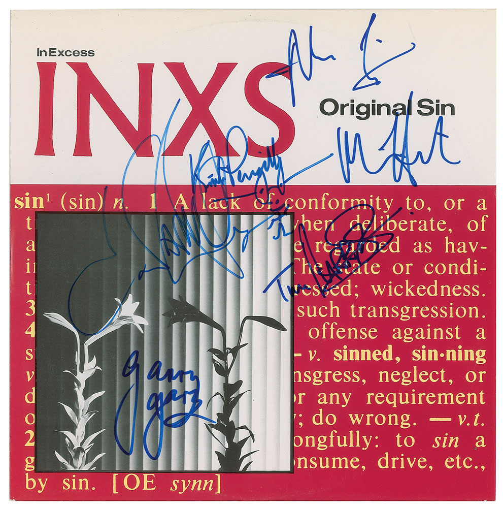 'Original Sin' single album by INXS, signed on the front cover in blue felt tip by Tim Farriss, Kirk Pengilly, Garry Gary Beers, Andrew Farriss, Jon Farriss, and Michael Hutchence. In fine condition. The record is included. From The John Brennan In-person Autograph Collection.