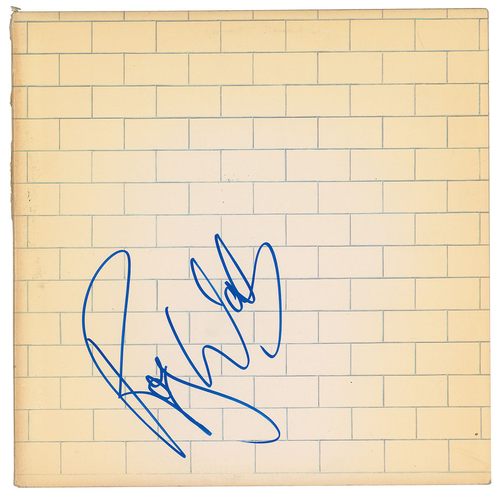 The Wall album by Pink Floyd, signed prominently on the front cover in blue felt tip by Roger Waters. In fine condition, with light overall toning. The record is included. A particularly clean and desirable example. From The John Brennan In-person Autograph Collection.