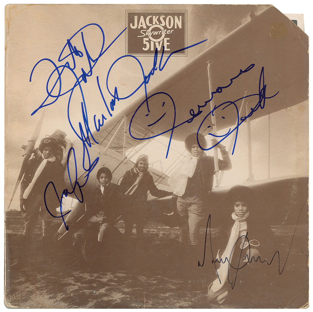 Skywriter album by the Jackson 5, signed on the front cover in black felt tip by Michael Jackson, and in blue felt tip by Tito, Marlon, Jackie, and Jermaine Jackson. In fine condition, with light edge wear and a clipped upper right corner. The record is included. From The John Brennan In-person Autograph Collection.