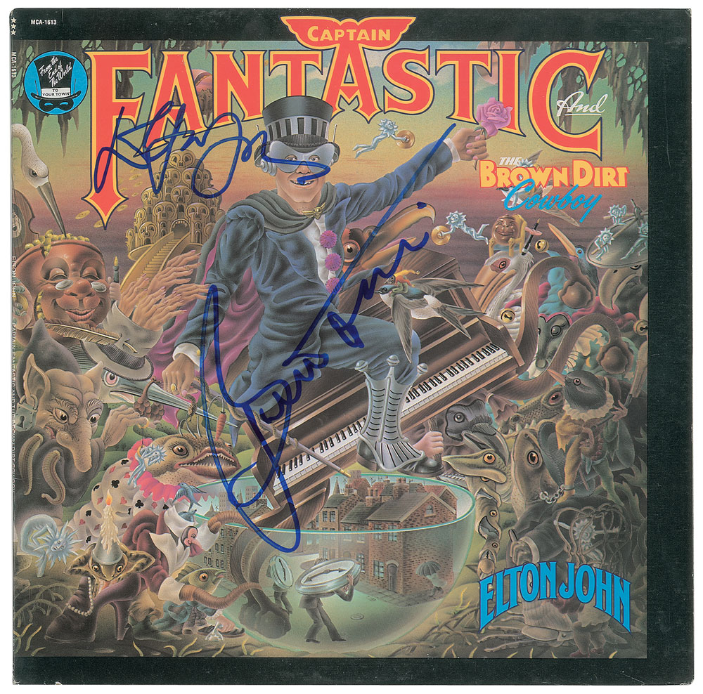 Captain Fantastic and the Brown Dirt Cowboy album signed on the front cover in blue felt tip by Elton John and Bernie Taupin. In fine condition. The record is included. An autobiographical account of the early musical careers of Elton John (Captain Fantastic) and Bernie Taupin (the Brown Dirt Cowboy), the album was released in May 1975 and debuted at number No. 1 on the US Billboard 200, becoming the first album to ever achieve such a feat. From The John Brennan In-person Autograph Collection.