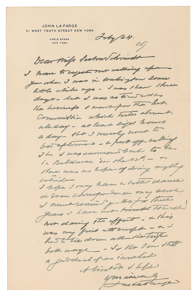 American painter, muralist, stained glass window maker, decorator, and writer (1835-1910) renowned for his pioneering use of opalescent glass. ALS signed “Jno. La Farge,” one page, 5.5 x 8.5, personal letterhead, February 24, 1907. Letter to "Miss Seaton Schmidt," in part: "I have to regret not calling upon you when I was in Washington some little while ago. I was there three days—but I was so tired with the business?for the Art Commission which took almost all day?that I merely went to bed afternoons." In fine condition, with light show-through from two small mounting remnants on the reverse.