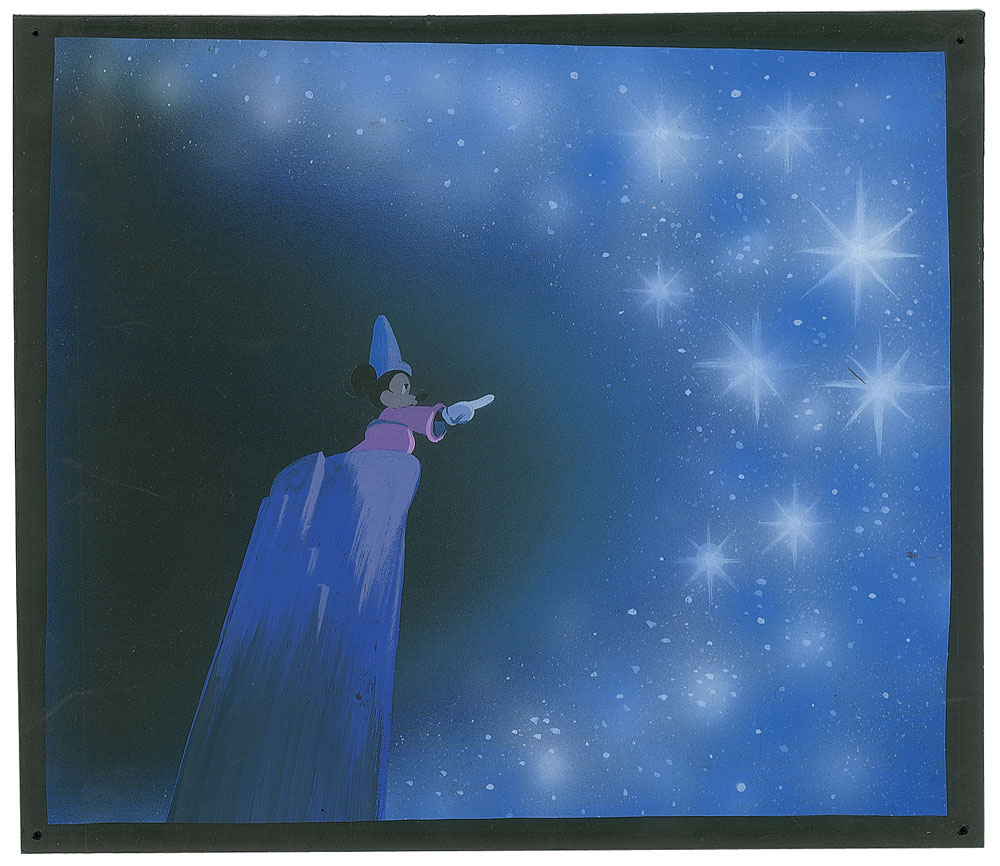 (Walt Disney Studios, 1940) Outstanding original watercolor concept painting featuring Mickey Mouse in the 'Sorcerer's Apprentice' segment from Fantasia, showing him wearing the sorcerer's hat while standing on the pinnacle of the mountain, conducting the stars of the universe during his great dream. Accomplished in watercolor on a black 8 x 7 board. In fine condition, with small tack holes to corners. A vivid and imaginative scene from one of Disney's animated masterpieces.