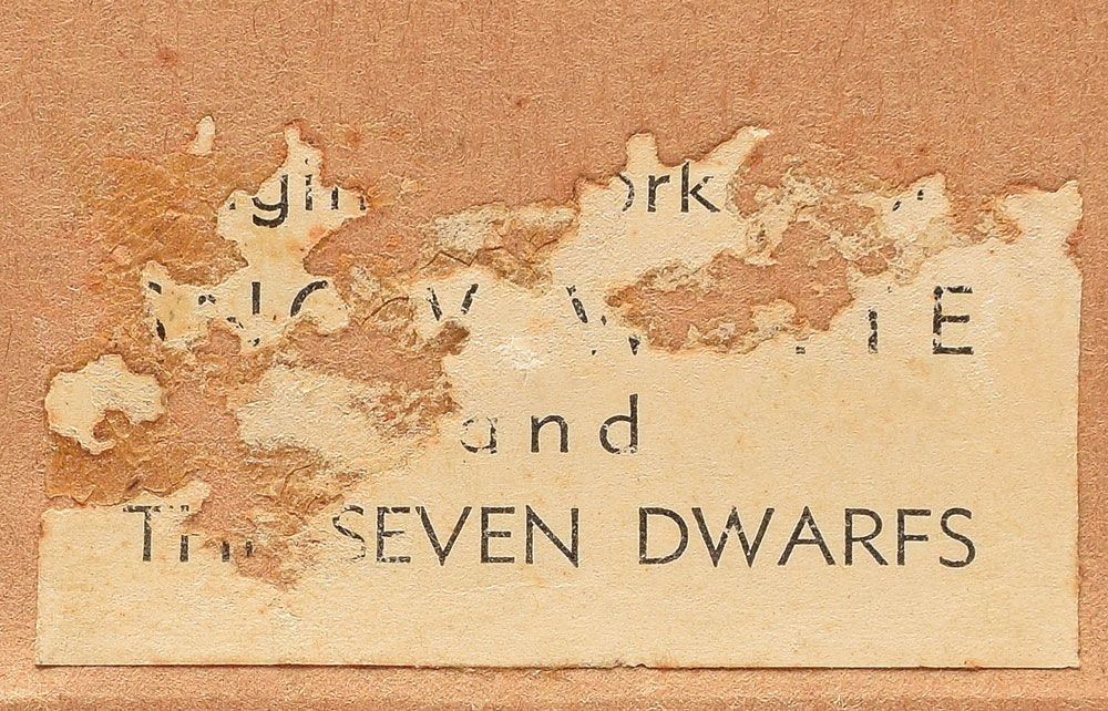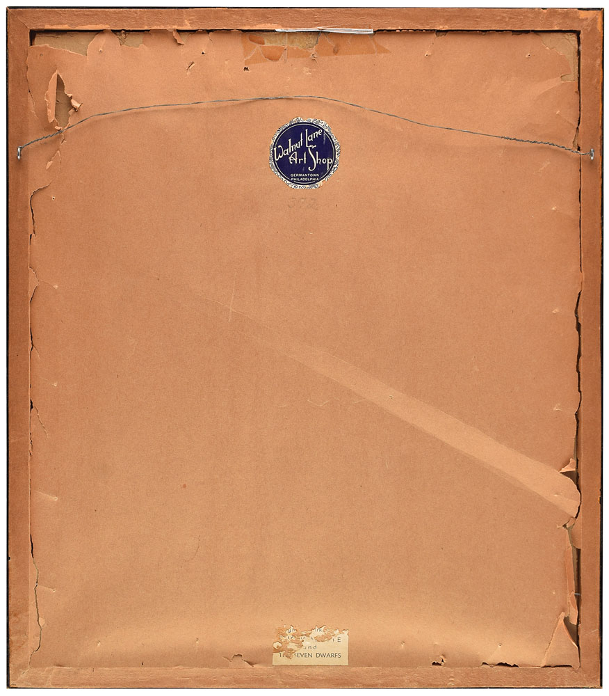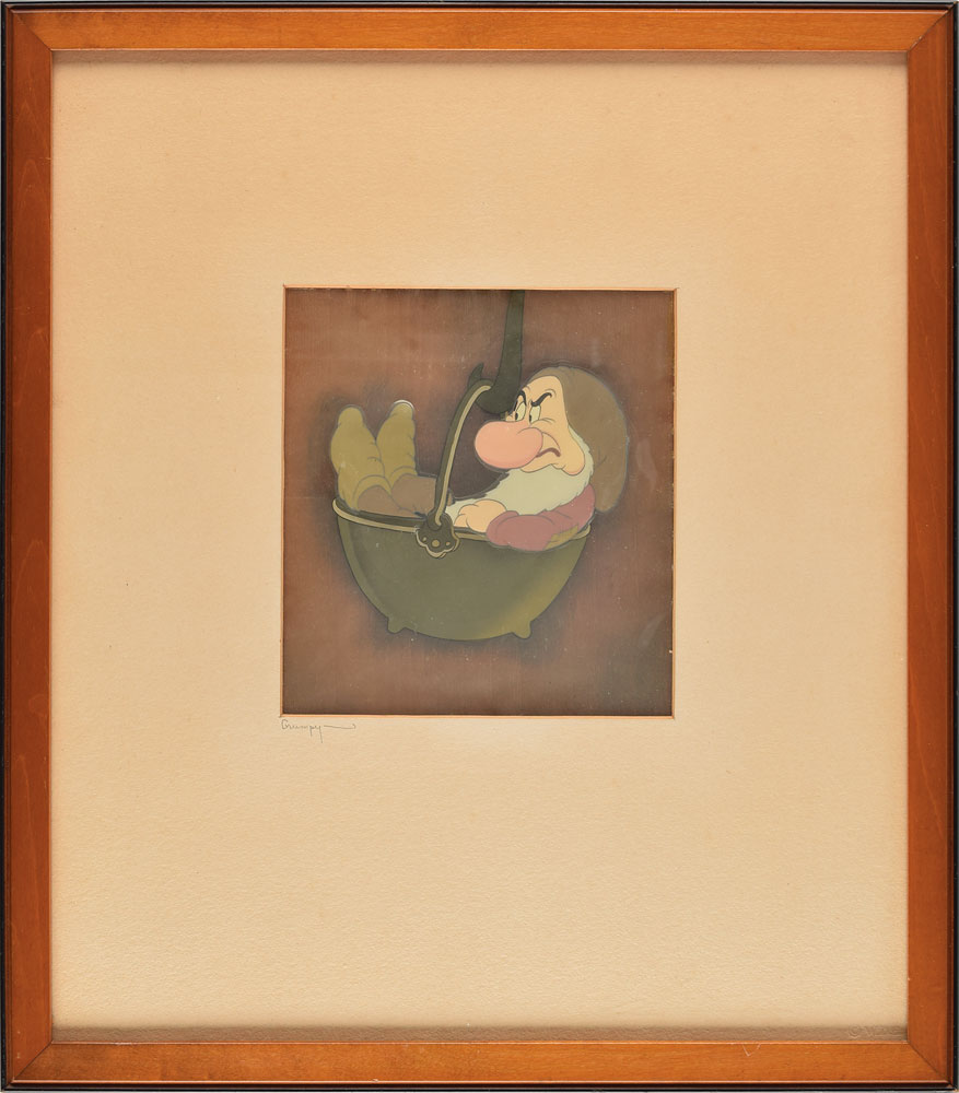 (Walt Disney Studios, 1937) Original production cel featuring Grumpy from Snow White and the Seven Dwarfs, showing him slumped down and hanging in a cauldron. The cel has been trimmed and applied to a woodgrain background as prepared by Courvoisier Galleries for sale. Image measures 4.5 x 5.25, with a mat opening of 5.75 x 6.25. Framed to an overall size of 14 x 16.25. Retains a small portion of the Courvoisier Galleries label on the reverse. In fine condition.