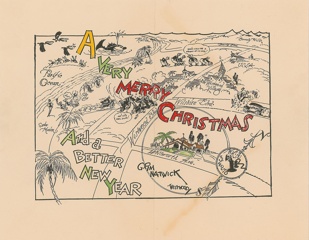 Circa 1930s personal Christmas card from legendary Fleischer Studio animator Grim Natwick, 10.5 x 8.25, which shows a wonderfully detailed map of Los Angeles by Natwick, who adds a number of clever gags, his telephone number, and notable places and landmarks like Santa Monica, Malibu, Beverly Hills, UCLA, and Westwood Village. In fine condition. Accompanied by the original mailing envelope.