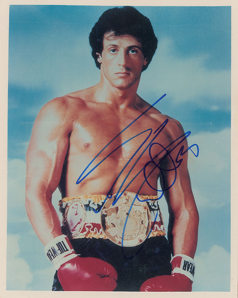 Color glossy 8 x 10 photo of Sylvester Stallone as he's pictured on the poster for Rocky III, signed in blue felt tip. In fine condition. From The John Brennan In-person Autograph Collection.