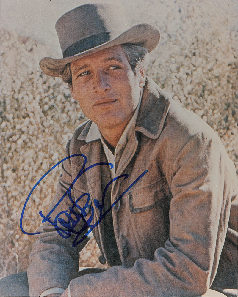 Color glossy 8 x 10 photo of Paul Newman as he appeared in the 1969 Western Butch Cassidy and the Sundance Kid, signed in blue felt tip. In fine condition, with light surface scuffing. From The John Brennan In-person Autograph Collection.