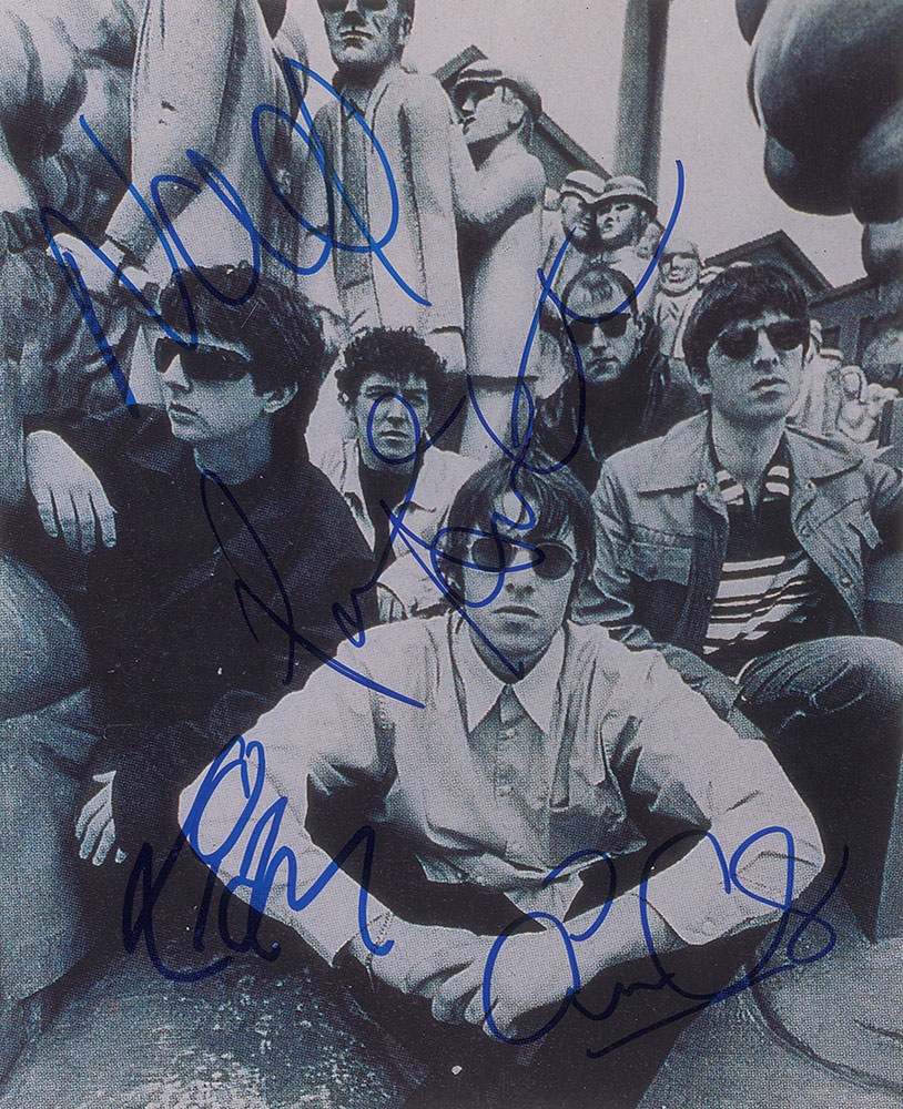 Glossy 8 x 9.75 photo Oasis posing in front of a row of statues, signed in blue felt tip by Liam and Noel Gallagher, Paul Arthurs, and Paul McGuigan. In fine condition, with somewhat grainy image quality. From The John Brennan In-person Autograph Collection.