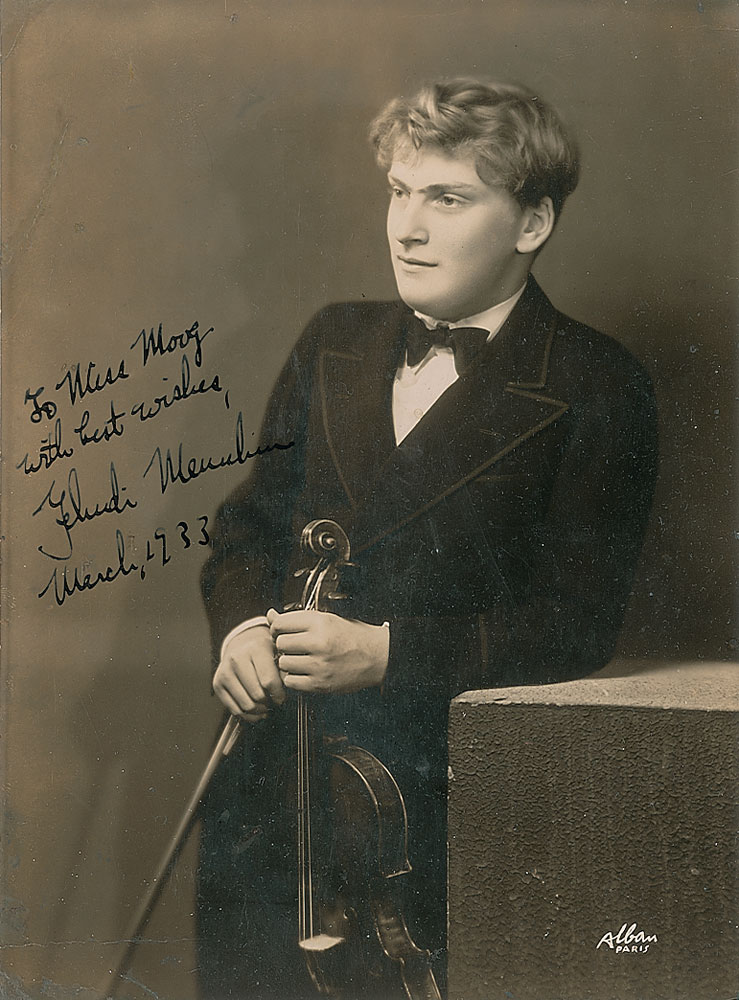 Vintage pearl-finish 6.75 x 9 half-length photo of the great violinist by the Alban Studio of Paris, signed and inscribed in fountain pen, "To Miss Moog, with best wishes, Yehudi Menuhin, March, 1933.” Reverse bears an Alban Studio stamp. In very good condition, with creasing, light silvering, surface impressions, and tiny pin hole to the top edge.