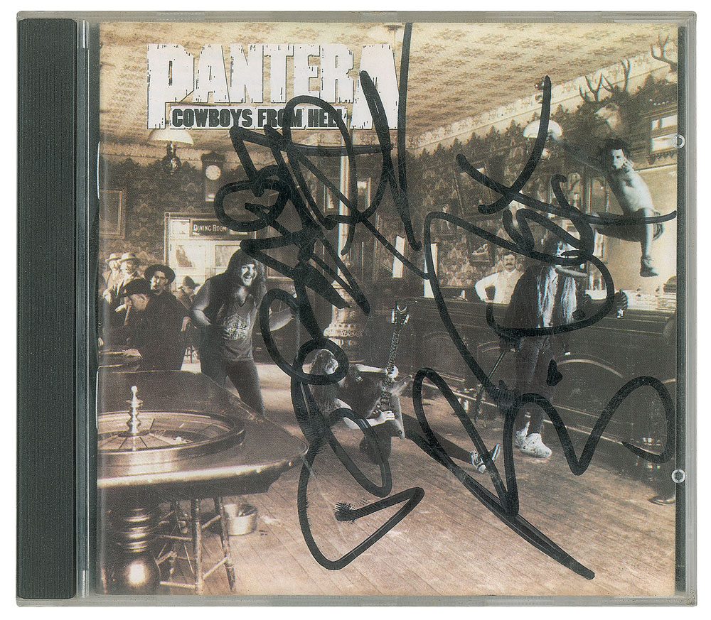 Cowboys from Hell CD by Pantera, signed on the front of the booklet in black felt tip by Phil Anselmo, Dimebag Darrell, Rex Brown, and Vinnie Paul. In fine condition. The CD is included. One of the most influential metal albums of the 1990s. Consignor notes that the autographs were obtained in Sydney, Australia in 1996.