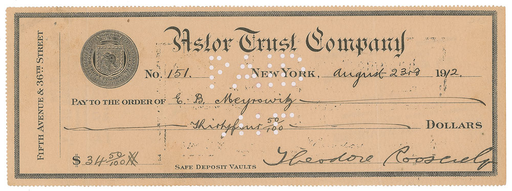 Astor Trust Company check, 8.5 x 3, filled out in another hand and signed by Theodore Roosevelt, payable to E. B. Meyrowitz for $34.50, August 23, 1912. In fine condition, with two vertical folds. Roosevelt's signature prominently displays along bottom. Established in 1875 by Emil Bruno Meyrowitz, E. B. Meyrowitz has long been a top purveyor of high-end optical goods and features a huge database of notable customers from the past, like Theodore Roosevelt, Amelia Earhart, and Charles Lindbergh.
