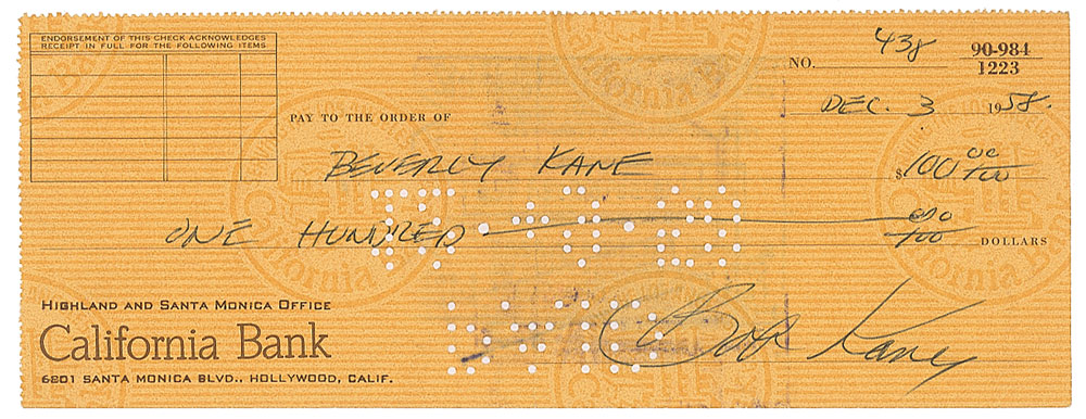California Bank check, 8 x 3, filled out and signed by the legendary Batman creator, "Bob Kane," payable to his ex-wife Beverly Kane for $100, December 3, 1958. In fine condition.