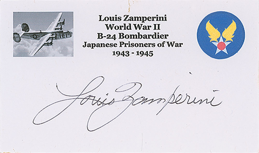 WWII prisoner of war and former Olympic distance runner (1917-2014). Ballpoint signature, "Louis Zamperini,” on a white 5 x 3 card. In fine condition.