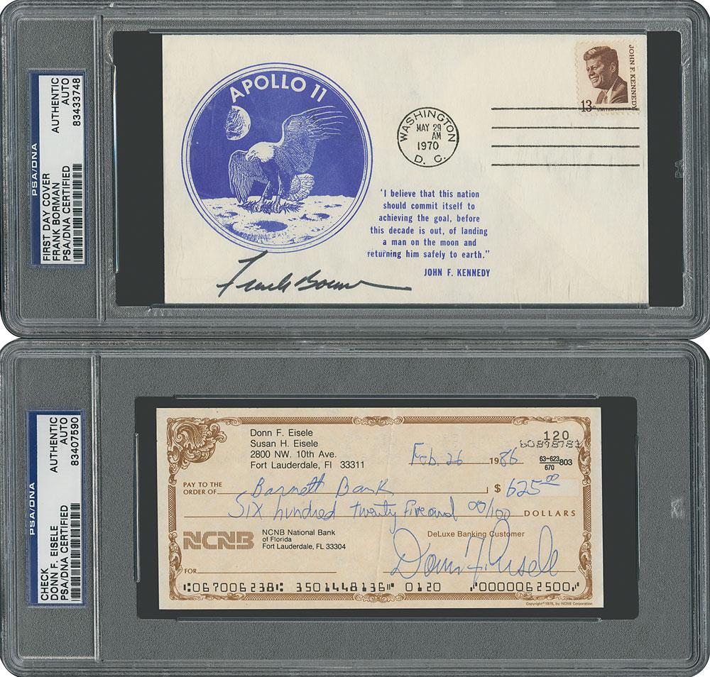 Two astronaut autographs: a commemorative cover with a cachet honoring Apollo 11, signed in black felt tip by Frank Borman; and a personal check, 6 x 2.75, filled out and signed by Donn Eisele, payable to Barnett Bank for $625, February 26, 1986. In overall fine condition. Both are encapsulated in PSA/DNA authentication holders.