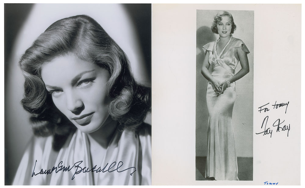 Four glossy photos of actresses from Hollywood's Golden Age, 8 x 10 and 10 x 8, each signed in black felt tip. Includes: Lauren Bacall, Lizabeth Scott, Fay Wray (ins), and Jane Russell. In overall fine condition, with an ink notation to the lower border of the Wray photo.