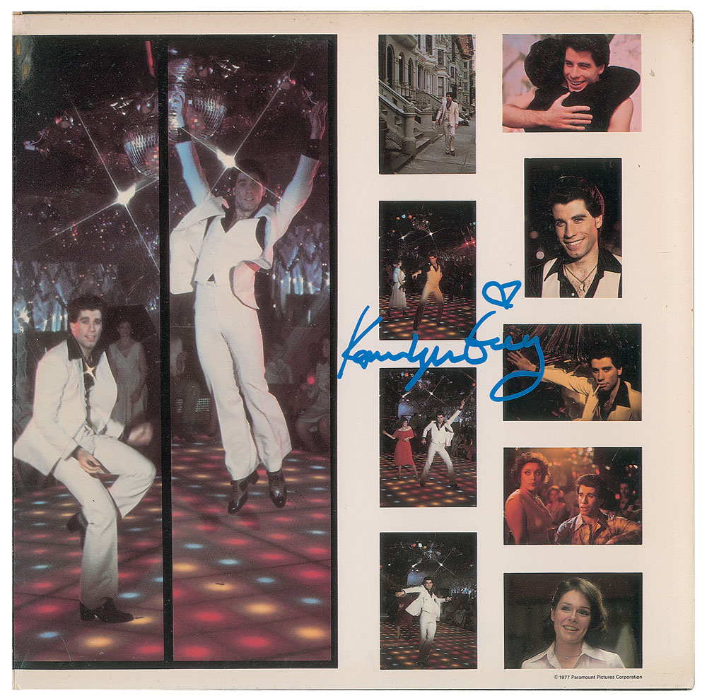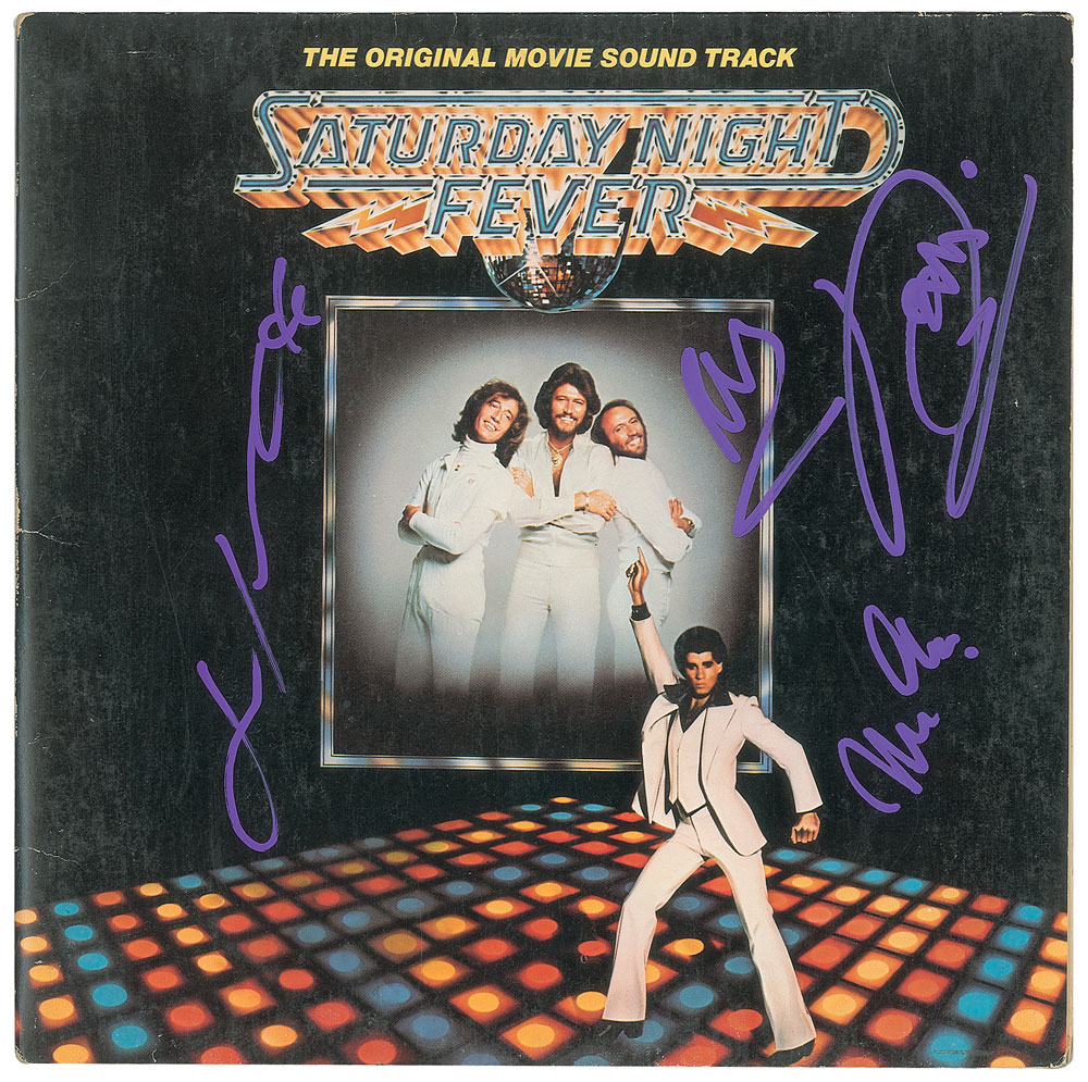 Saturday Night Fever movie soundtrack album signed on the front cover in purple paint pen by Barry, Robin, and Maurice Gibb, and John Travolta, with inner gatefold signed in blue paint pen by Karen Lynn Gorney. In fine condition, with some light edge wear. The record is included. From The John Brennan In-person Autograph Collection.