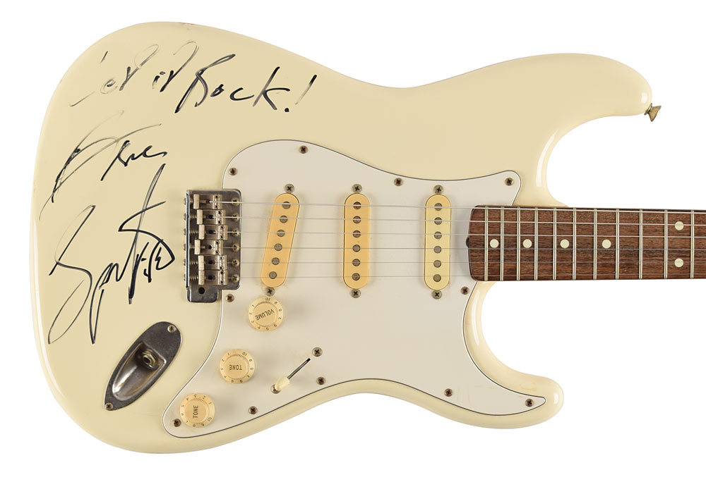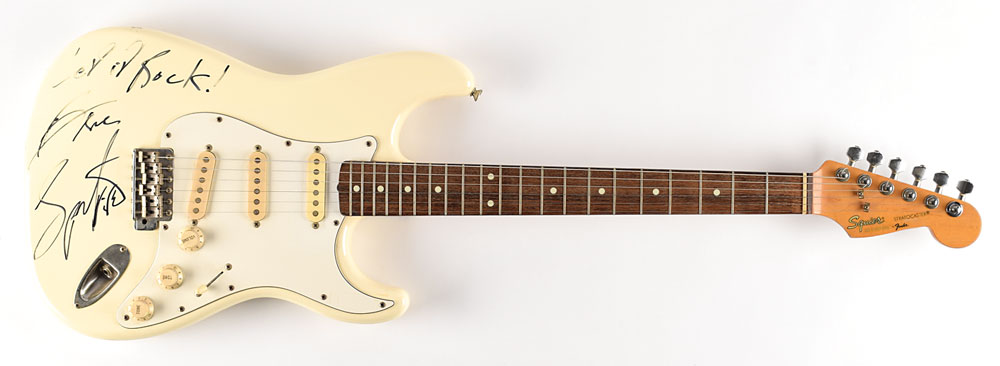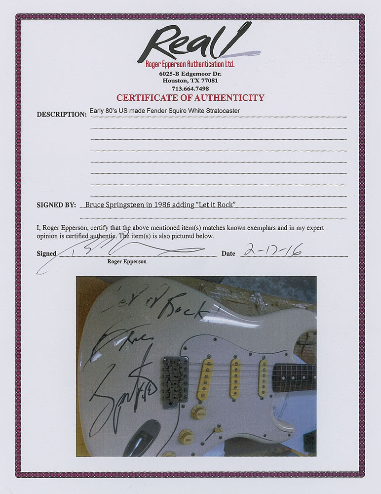 Handsome cream-bodied Fender Squier Stratocaster electric guitar, prominently signed on the body in black felt tip, "Let it Rock! Bruce Springsteen." In fine condition, with pen trouble rendering a few letters somewhat light, and a few scuffs and dings to the guitar (which lacks one of its strap buttons). Accompanied by a full letter of authenticity from REAL, stating that it was signed in 1986. The consignor notes that Springsteen signed this for a record store in his native New Jersey, and that he may have even played a song on it. A desirable display piece boasting a huge autograph from 'The Boss.'