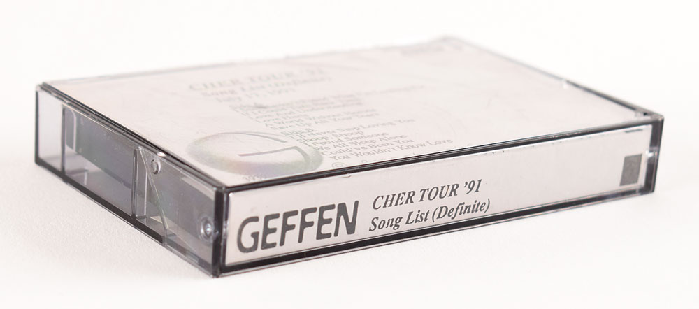 Song list demo tape in a case with Geffen Records insert labeled "Cher Tour '91, Song List (Definite), July 17, 1991," listing Side A tracks as 'I Still Haven't Found What I'm Looking For,' 'If I Could Turn Back Time,' 'Love And Understanding,' 'Love Hurts,' 'A World Without Heroes,' and 'Save Up All Your Tears,' and Side B tracks as 'I'll Never Stop Loving You,' 'Shoop, Shoop,' 'I Found Someone,' 'We All Sleep Alone,' 'Could've Been You,' and 'You Wouldn't Know Love.' The tape itself is annotated "Cher, Song List, '91" on both sides. Inside the case are several laminated labels associated with Gavin Menzies, a noted guitar tech and music industry insider. The consignor notes that this originates from the personal collection of Gavin Menzies. Interestingly, Cher did not embark upon a tour in 1991—she wrapped up the Heart of Stone Tour in December 1990, and began the Love Hurts Tour in April 1992.