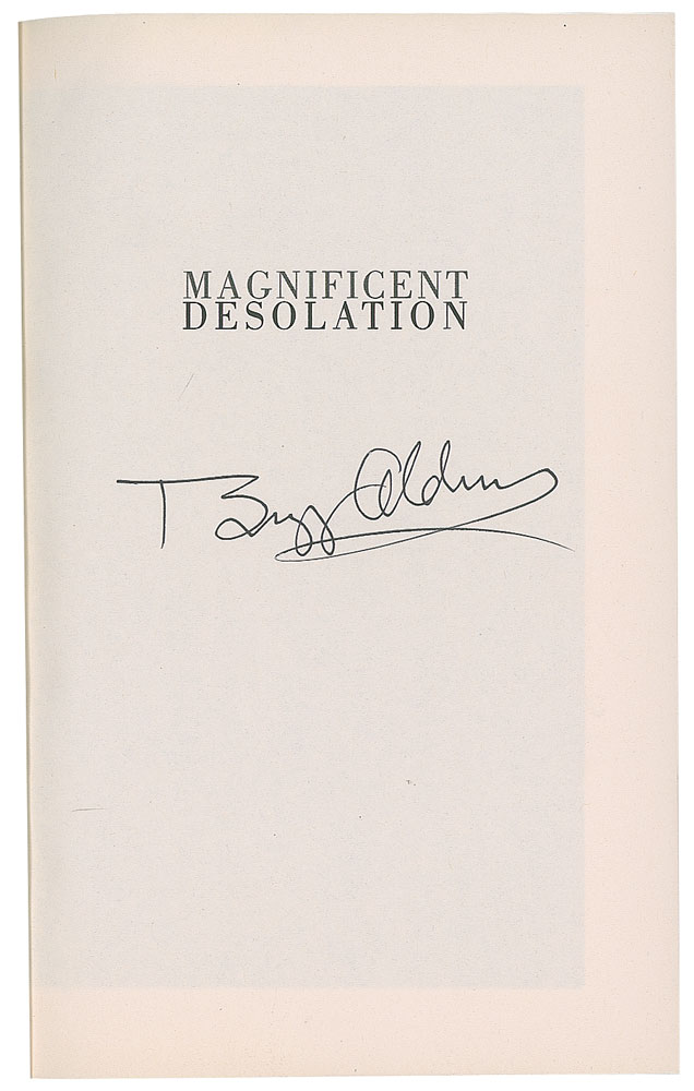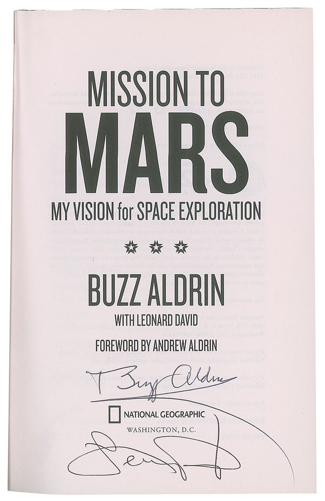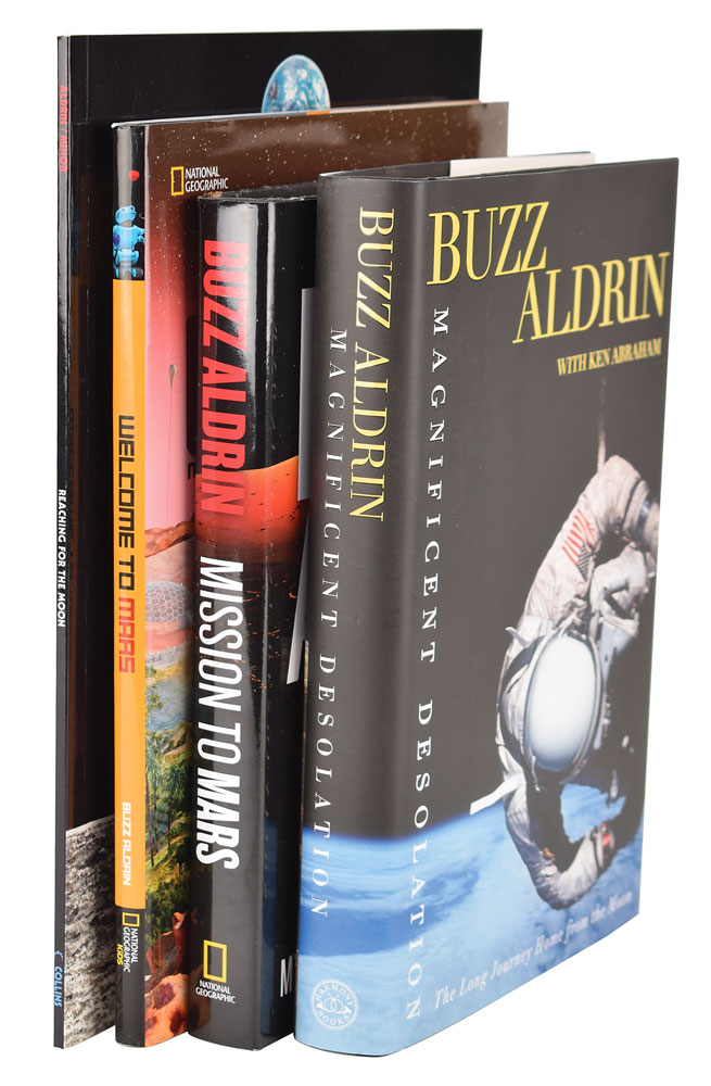 Four books signed by the second moonwalker: Magnificent Desolation, hardcover with dust jacket, signed on the title page in black felt tip by Aldrin; Mission to Mars, hardcover with dust jacket, signed on the title page in black ballpoint by Aldrin and co-author Leonard David; Welcome to Mars, hardcover with dust jacket, signed on the title page in blue felt tip by Aldrin; and Reaching for the Moon, softcover, signed on the title page in blue ballpoint by Aldrin. In overall fine to very fine condition.