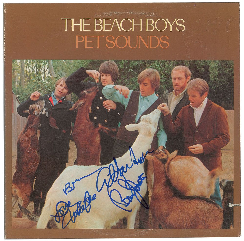 Pet Sounds album by the Beach Boys, signed on the front cover in blue felt tip by Brian Wilson, Al Jardine, Mike Love, and Bruce Johnston. In fine condition, with a discount cut to right edge. The record is included. Highlighted by classics including 'Sloop John B,' 'Wouldn't It Be Nice,' and 'God Only Knows,' Pet Sounds was originally promoted as 'the most progressive pop album ever,' and today takes a place among the most influential albums ever recorded. From The John Brennan In-person Autograph Collection.