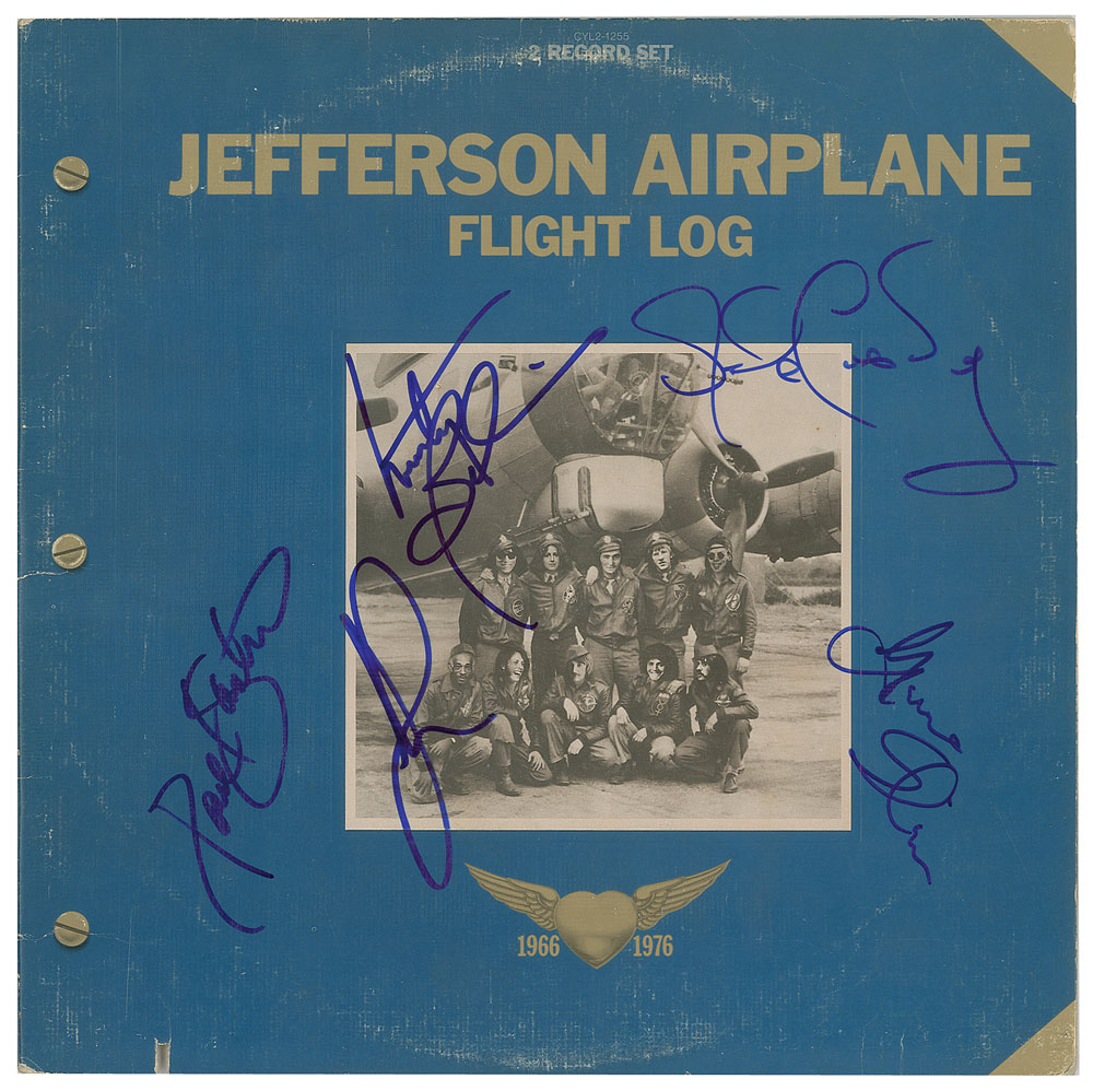 Flight Log (1966-1976) album by Jefferson Airplane, signed on the front cover in blue felt tip by Grace Slick, Paul Kantner, Marty Balin, Jorma Kaukonen, and Jack Casady. In very good to fine condition, with light scuffing, and a discount cut to the bottom edge. The record is not included. From The John Brennan In-person Autograph Collection.