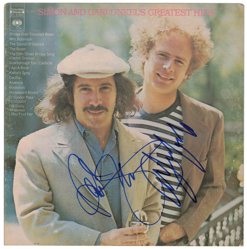 Simon and Garfunkel's Greatest Hits album signed on the front cover in blue felt tip by Paul Simon and Art Garfunkel. In fine condition, with light scuffing. The record is included. From The John Brennan In-person Autograph Collection.