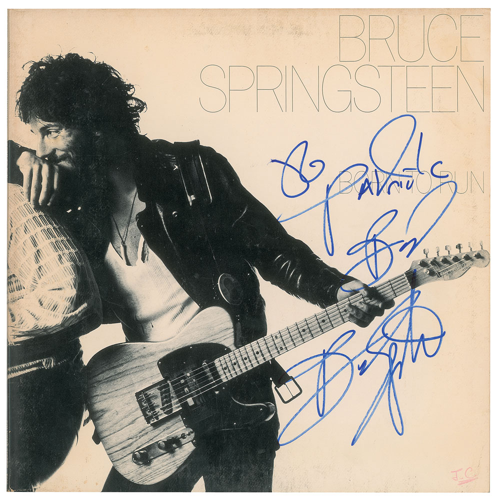 Born to Run album signed and inscribed on the front cover in blue felt tip, "To Patrick, Bruce Springsteen." In fine condition, with light scuffing. The record is included. From The John Brennan In-person Autograph Collection.