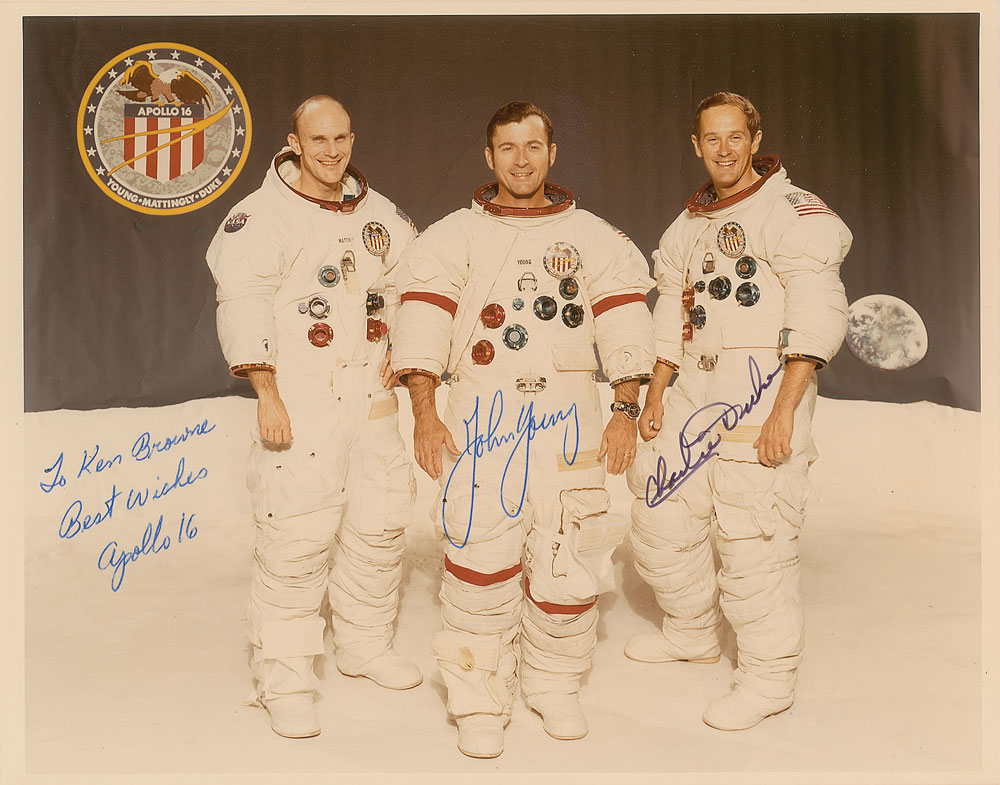 Official color glossy 10 x 8 NASA photo of the Apollo 16 crew posing in their white space suits, signed and inscribed in blue ballpoint, "To Ken Browne, Best wishes, Apollo 16, John Young," and in black felt tip, "Charlie Duke.” Reverse bears purple NASA caption text and "A Kodak Paper" watermarks. In fine condition, with one tiny dent above the insignia in the upper left.