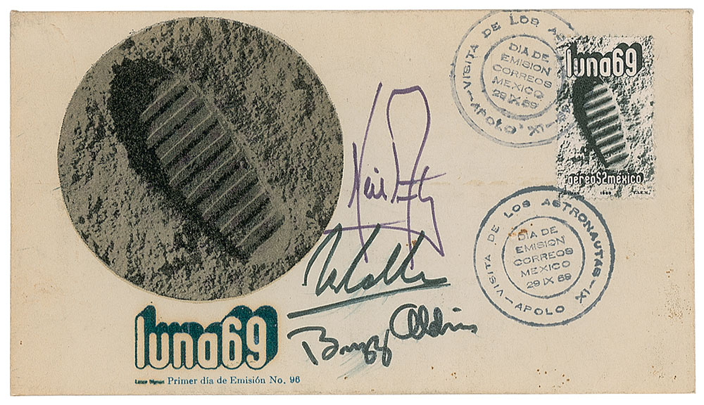 Rare Mexican 'Luna 69' FDC with an attractive cachet of a lunar bootprint from the Apollo 11 mission, signed in black felt tip, "Neil Armstrong," "M. Collins," and "Buzz Aldrin." The cover features a pair of Correos de Mexico postmarks dated September 29, 1969, the day the Apollo 11 crew arrived in Mexico City for the first stop of their historic Giant Step Presidential Goodwill Tour. In fine condition, with slight brushing to Aldrin's signature.