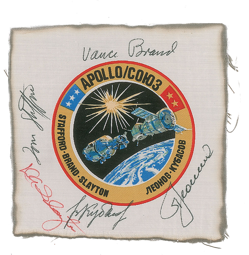 Desirable 5.25 x 5.25 swatch of Beta cloth featuring the ASTP mission insignia, signed in black and red ink by Deke Slayton, Tom Stafford, Vance Brand, Alexei Leonov, and Valery Kubasov. In fine condition, with staining and slight fraying to edges.