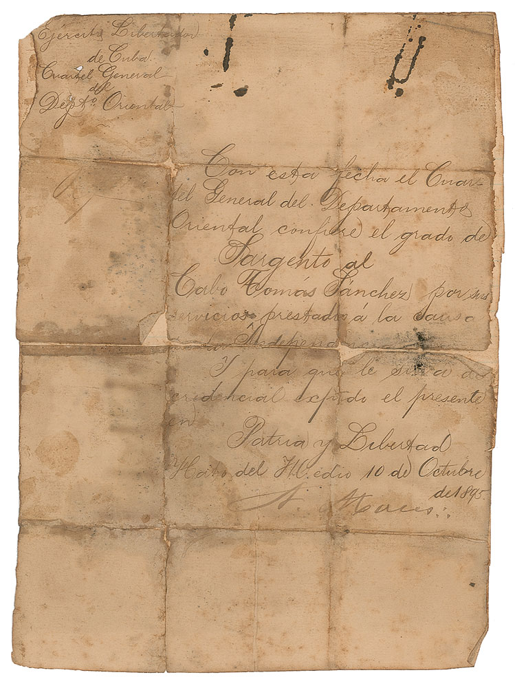 Distinguished general (1848-1896) who was second-in-command of the Cuban army during the War of Independence against Spain. Untranslated manuscript DS in Spanish, signed “A. Maceo,” one page, 6.25 x 8.5, October 10, 1895. In good to very good condition, with trimmed edges, soiling, staining, rusty paperclip impressions, and complete separations along intersecting folds. Accompanied by a full letter of authenticity from PSA/DNA.