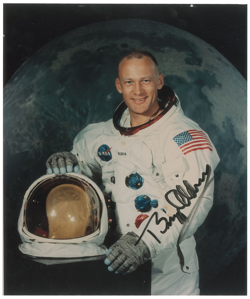 Color satin-finish 7.5 x 9 photo of Buzz Aldrin posing in his white space suit with the moon in the background, signed in black felt tip. In fine condition, with trimmed edges and a PSA/DNA label affixed to the reverse (certificate not present).