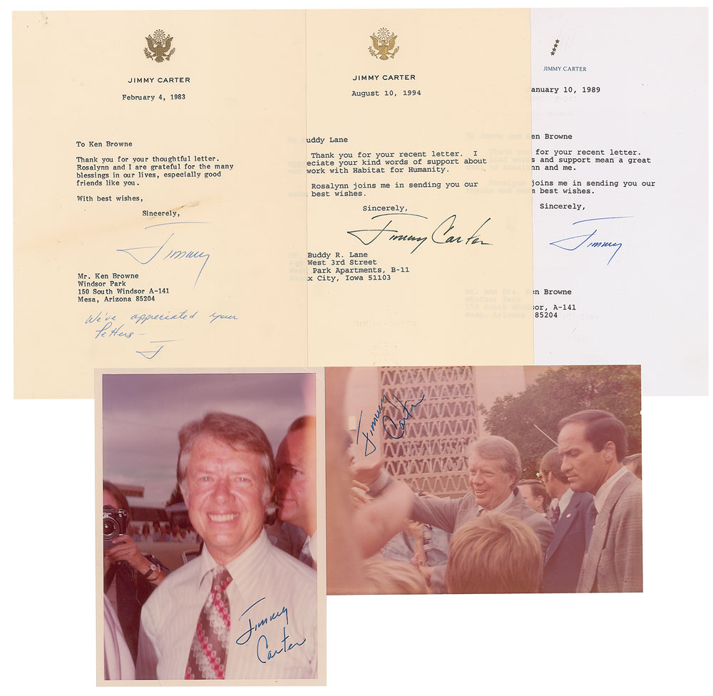 Group lot of five items signed either “Jimmy” or “Jimmy Carter,” including: a pair of color satin-finish photos, 5 x 7 and 7 x 5, showing Jimmy Carter campaigning in Phoenix on September 13, 1976, with typed notation on reverse of each dating the autographs to October 8, 1990; and three TLSs, each one page, 6.25 x 8.5, dated to 1983, 1989, and 1994, with Carter extending thanks for letters received, with one bearing an initialed handwritten postscript: “We’ve appreciated your letters—J.” In overall fine condition. Accompanied by an original mailing envelope.