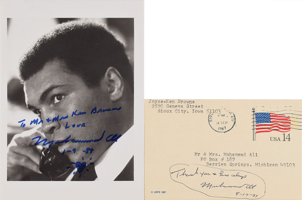 Two items: a glossy 5 x 7 photo of Muhammad Ali talking on the phone, signed and inscribed in blue felt tip, "To Mr. & Mrs. Ken Browne, Love, Muhammad Ali, 1-9-88," with a glowing heart sketch; and a ballpoint signature, "Thank you & Love always, Muhammad Ali, 9-17-87," on the reverse of a 5.5 x 3.5 postal card. In overall fine condition. Accompanied by the original mailing envelope, addressed in Ali's own hand.