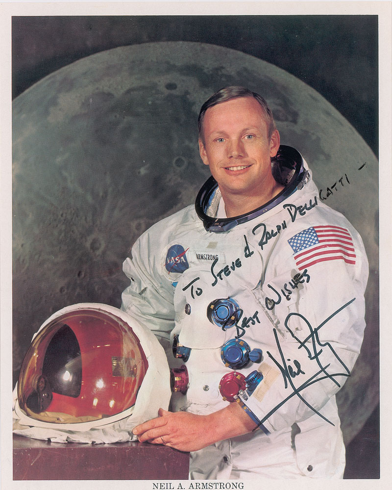 Official color 8 x 10 NASA lithograph of Armstrong posing in his white space suit against a lunar backdrop, signed and inscribed in black felt tip, "To Steve & Ralph Delligatti—Best wishes, Neil Armstrong.” In fine condition.