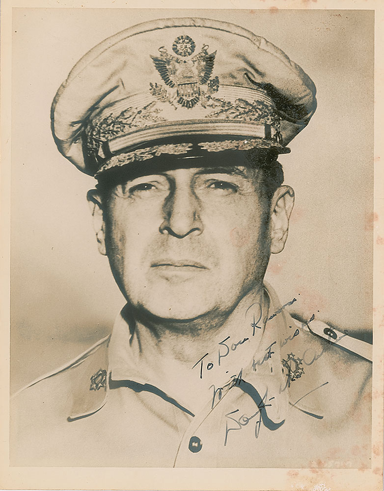 Vintage matte-finish 8 x 10.25 head-and-shoulders portrait of the American five-star general, signed and inscribed in fountain pen, "To Don Ransom, with best wishes, Douglas MacArthur.” In very good condition, with some creasing and silvering, staining to the right side, and some kind of clear adhesive residue or emulsion irregularity affecting the left side of MacArthur's face.