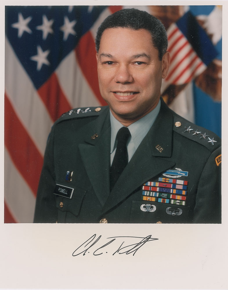 Color semi-glossy 8 x 10 photo of General Powell in his four-star military uniform, signed in the lower border in black felt tip, "Colin L. Powell." In fine condition.