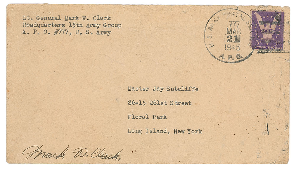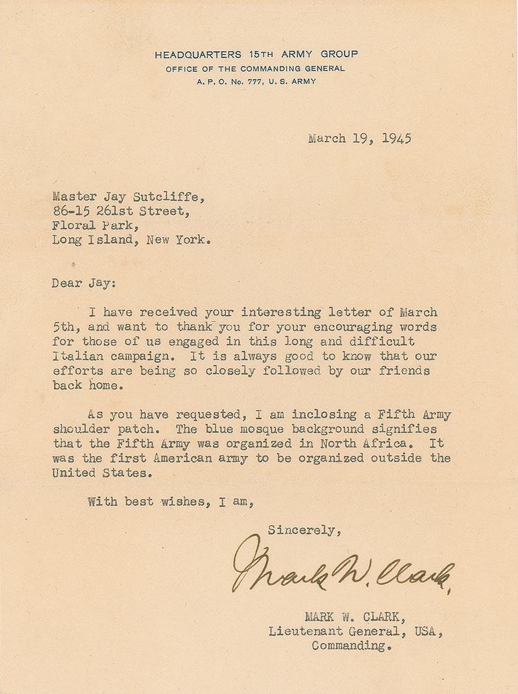 World War II-dated TLS, one page, 6 x 8, Headquarters 15th Army Group letterhead, March 19, 1945. Letter to Master Jay Sutcliffe, in full: "I have received your interesting letter of March 5th, and want to thank you for your encouraging words for those of us engaged in this long and difficult Italian campaign. It is always good to know that our efforts are being so closely followed by our friends back home. As you have requested, I am inclosing a Fifth Army shoulder patch. The blue mosque background signifies that the Fifth Army was organized in North Africa. It was the first American army to be organized outside the United States." In very good to fine condition, with scattered light creasing. Accompanied by the referenced patch and the original mailing envelope, which has also been signed by Clark.