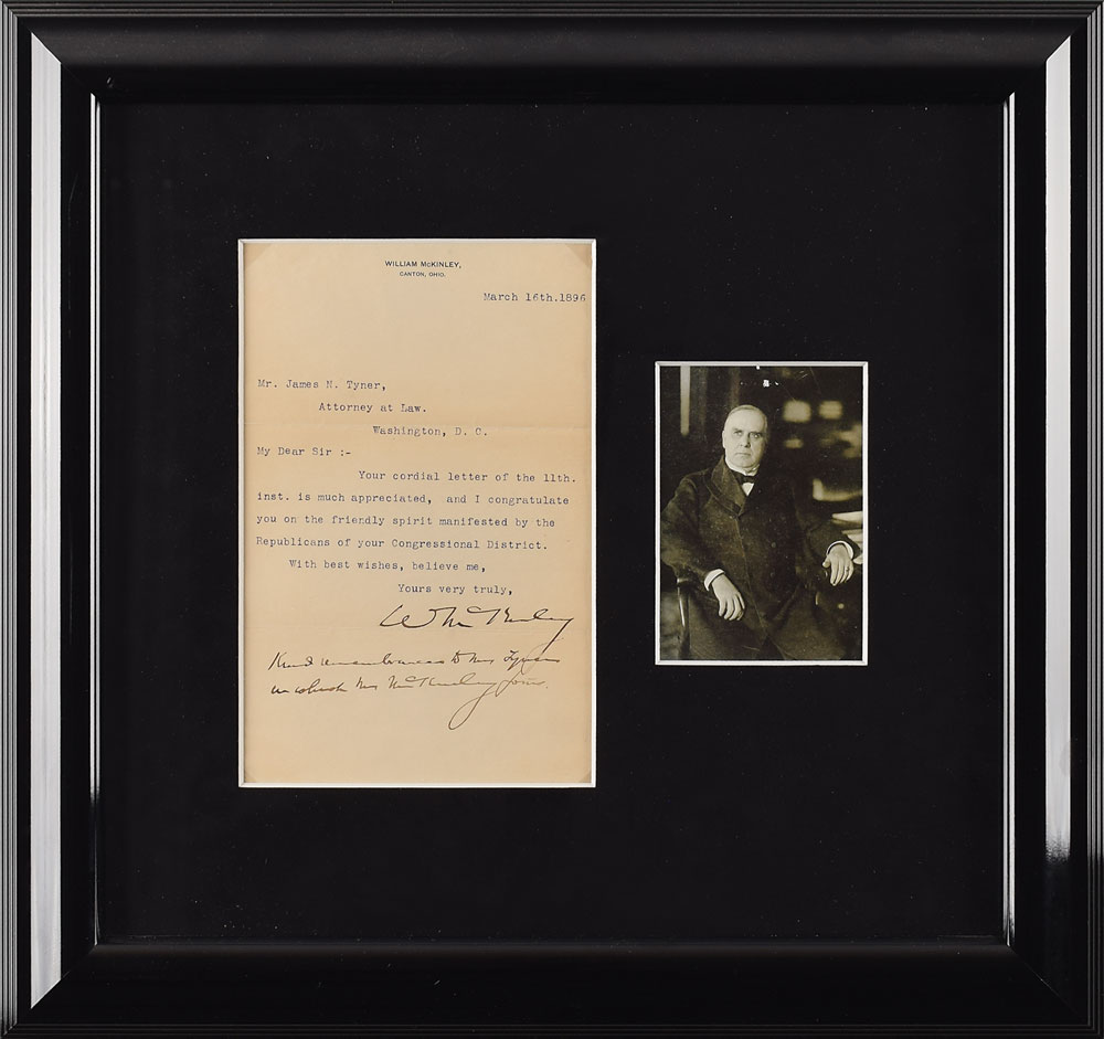 TLS signed "W. McKinley," one page, 5.25 x 8, personal letterhead, March 16, 1896. Short letter to attorney James Tyner, in full: "Your cordial letter of the 11th. inst. is much appreciated, and I congratulate you on the friendly spirit manifested by the Republicans of your Congressional District." McKinley adds a short postscript at the bottom, "Kind remembrances to Mrs. Tyner in which Mrs. McKinley joins." Matted and framed with an image of McKinley to an overall size of 16.25 x 15.5. In fine condition.
