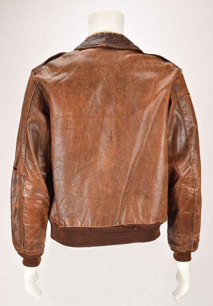 A published WWII USAAF 8th Air Force A-2 flight jacket with embroidered unit emblem of Lt. Ed Wanner, pilot of B-24 'Asbestos Alice' (700th Bomb Squadron, 445th Bomb Group). This attractive dark brown leather, issue jacket with russet-brown elastique hem and cuffs has a single, original Talon front zipper with collar snaps, a hook and eye fastener at the throat, and was not constructed with a collar stand. The label is no longer present, but the inspector’s ink stamp is still visible. The exterior leather is of a slightly lighter shade of brown than usual, with surface scuffs and wear throughout, as well as flaking along the edge seams, collar, and on the forearms and sleeves. Additionally, there are linear tears at the top of the right sleeve, and the zipper tab is missing at the hem. The cuffs are not heavily frayed, but the hem has scattered holes and tears. The jacket is embellished with an embroidered squadron patch (the Pegasus and Bomb emblem of the 700th Bomber Squadron with aircraft name: “ASBESTOS ALICE” written on the bomb case). A leather name strip is present just above the emblem: “E.A. WANNER.” The light brown interior lining of the jacket is in fair-good shape, but does exhibit quite a few tears at the collar, and a repaired tear at the left sleeve. The jacket is identified to Lt. Edmund A. Wanner Jr., pilot of the B-24 Liberator 'Asbestos Alice,' flying out of the 445th Bomb Group’s base at Tibenham, England. The group attacked numerous strategic targets in Germany and occupied Europe, and was nearly annihilated in the September 27, 1944 raid on Kassel, when a navigational error led the group away from the bulk of the 2nd Air Division formation, and straight into a scrambled 150 plane Sturmgruppe of Luftwaffe fighter aircraft. According to some accounts, only four aircraft made it back to England. This very jacket, along with a photograph of Wanner standing next to the nose of “Asbestos Alice," was published on pg. 85 of 'The Art of the Flight Jacket' by Maguire and Conway. This is a fantastic identified and published A-2 jacket.