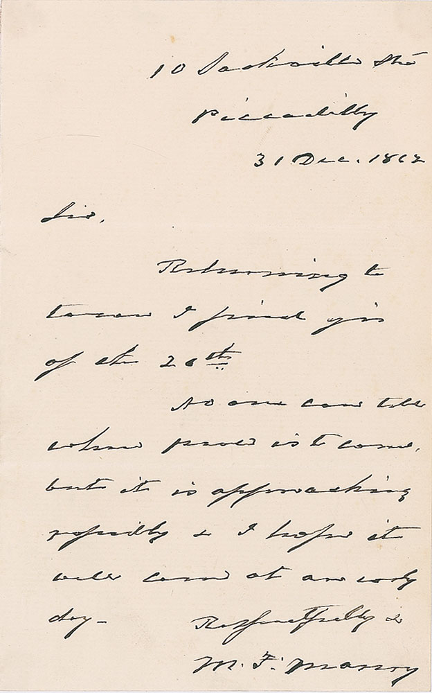 Pioneering naval officer, meteorologist, and oceanographer (1806-1873) who published the first textbook of modern oceanography. Civil War-dated ALS signed “M. F. Maury,” one page, 4.5 x 7.25, December 31, 1862. Maury writes from London, in full: "Returning to town & find yrs of the 20th. No one can tell when peace is to come but it is approaching rapidly & I hope it will come at an early day." In fine condition. Because of his status as an internationally renowned figure, Maury spent much of the Civil War abroad, disseminating propaganda for the Confederacy and purchasing ships and supplies for its navy from nations like England, Ireland, and France.