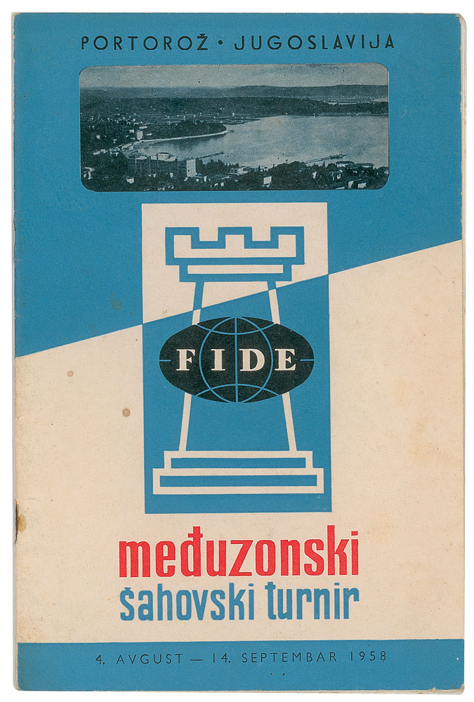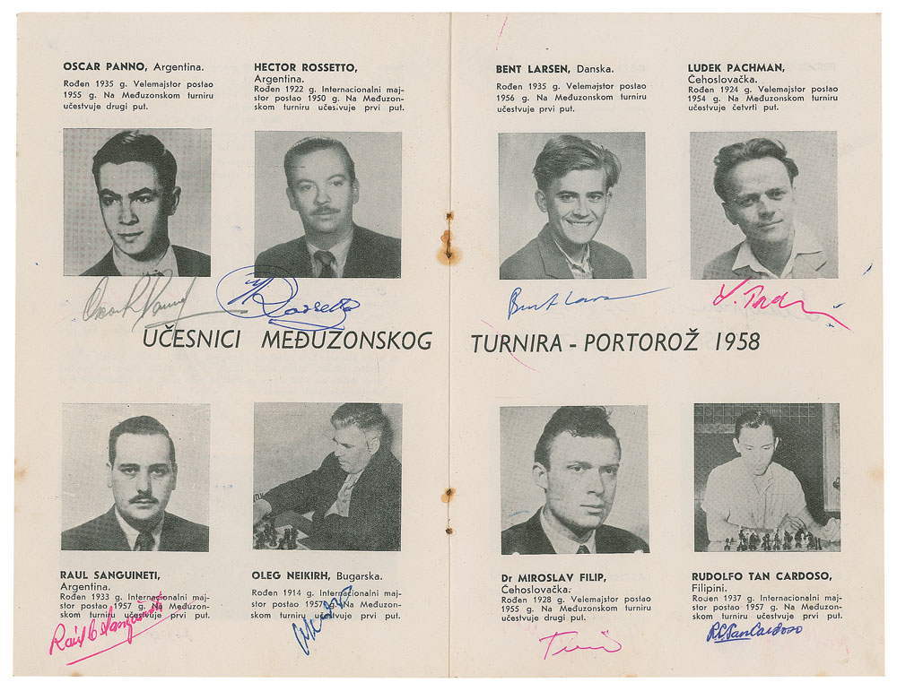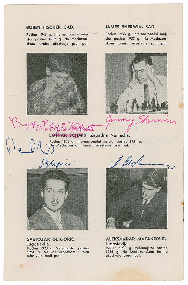 Magnificent original FIDE (World Chess Federation) program for the Interzonal Chess Tournament held in Portoro?, SR Slovenia, SFR Yugoslavia between August 4 and September 14, 1958, 20 pages, 5.75 x 8.75, signed inside below his image in red ballpoint by Bobby Fischer, who crosses out the name of Lothar Schmid below and adds "Poul Benko [sic]." The program is signed inside in pencil and ink by 20 other competitors from the tournament, including: Yuri Averbakh, Pal Benko, David Bronstein, Rodolfo Cardoso, Boris de Greiff, Miroslav Filip, Géza Füster, Svetozar Gligoric, Bent Larsen, Aleksandar Matanovic, Oleg Neikirch, Friðrik Ólafsson, Ludek Pachman, Oscar Panno, Tigran Petrosian, Héctor Rossetto, Raúl Sanguineti, James Sherwin, László Szabó, and Mikhail Tal. The program is also signed by chess arbiters Harry Golombek and Vladimir Vukovic. In fine condition, with general handling wear, and light stains to the bottom edges of some of the pages.