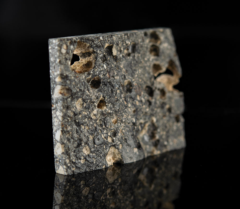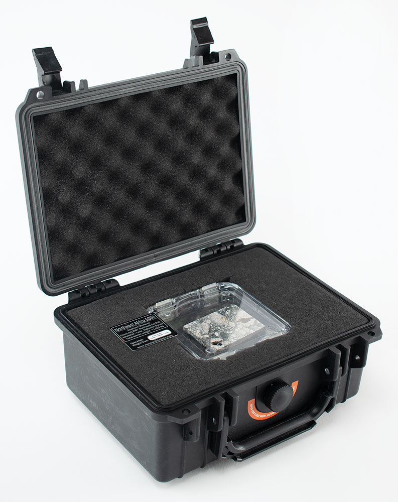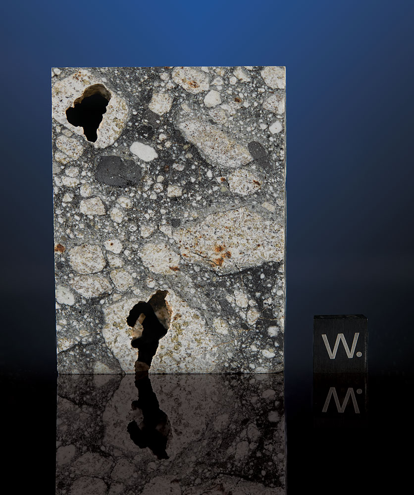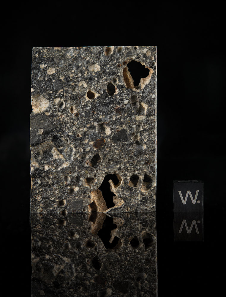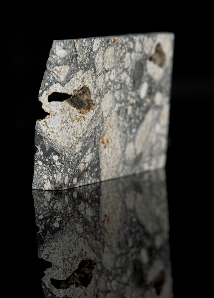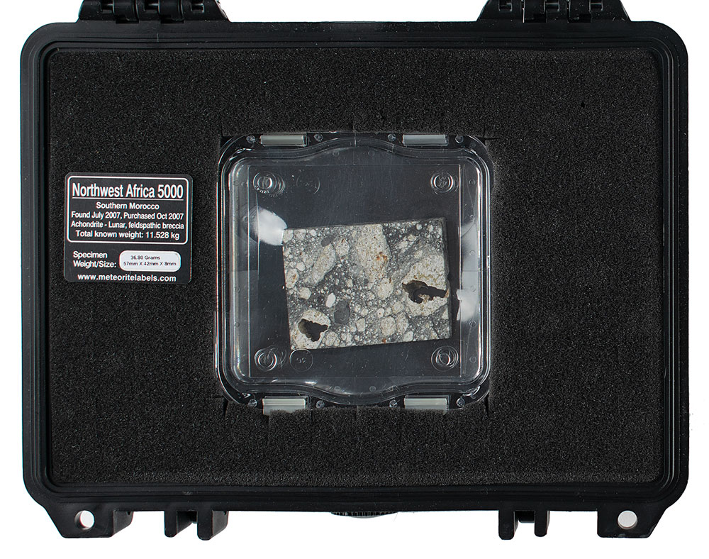 Lunar meteorite, lunar highlands monomict gabbroic breccia, Northwest Africa, found 2007. Part slice, “The Eclipse," weighing 36.80 grams and measuring 57 mm x 42 mm x 8 mm. Adam Hupé, the original owner of the main mass of this meteorite, remarked that he observed a lunar eclipse on the evening of February 20th 2008 from Titlow Beach, Washington, through the two naturally occurring holes in this specimen, hence its name, "The Eclipse." This slice has an outside surface with rare translucent fusion crust (the four edges and one surface are polished leaving the second surface unfinished). Accompanied by a metal identification tag, a color identification card, portfolio, custom fitted Pelican case for added safety and security and a certificate of authenticity and other paperwork from the Von Hupé Planetary Collection. To the best of our knowledge, this is the first time in human history the Moon has been viewed through a piece of the Moon from Planet Earth, and this piece comes with a sworn affidavit stating such. Hupé was also the first to view a solar eclipse through a piece of the Moon the morning of August 21st, 2017.