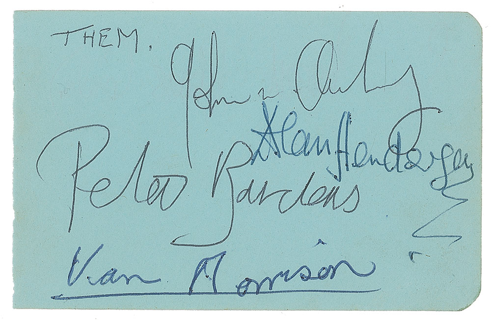 Vintage circa 1965 ballpoint signatures of Van Morrison, Peter Bardens, Alan Henderson, and one other on a light blue 4 x 2.5 album page. In fine condition.