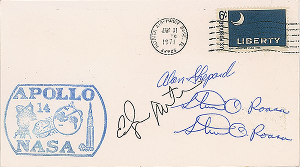 Apollo 14 launch day cover with a stamped cachet honoring the mission, postmarked at Patrick Air Force Base in Florida on January 31, 1971, neatly signed in blue ballpoint by Alan Shepard and Stu Roosa (twice), and in black ink by Edgar Mitchell. In fine condition. An unusual example boasting two signatures from the Command Module Pilot, plus single autographs from the mission's moonwalkers.