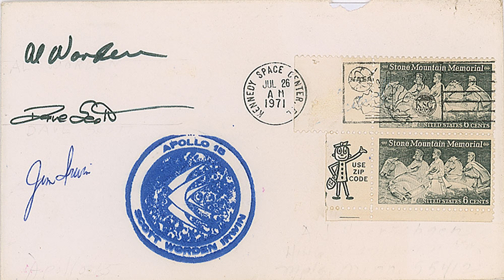 Apollo 15 launch day cover with a stamped cachet of the mission insignia, postmarked at Kennedy Space Center on July 26, 1971, neatly signed in black felt tip by Al Worden and Dave Scott, and in blue ballpoint by Jim Irwin. In very good to fine condition, with a couple small tears and a spot of paper loss to the top edge.