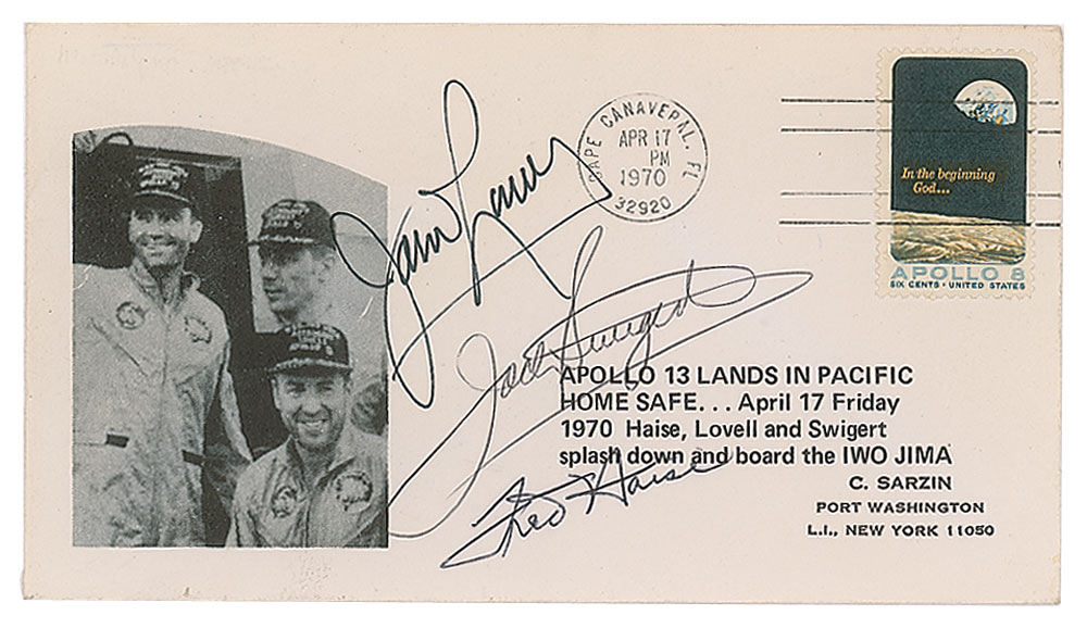 Apollo 13 recovery cover with a printed cachet honoring their successful splashdown in the Pacific, postmarked at Cape Canaveral on the return date of April 17, 1970, signed in black ballpoint by Jack Swigert and Fred Haise, and in black felt tip by Jim Lovell. In fine condition.